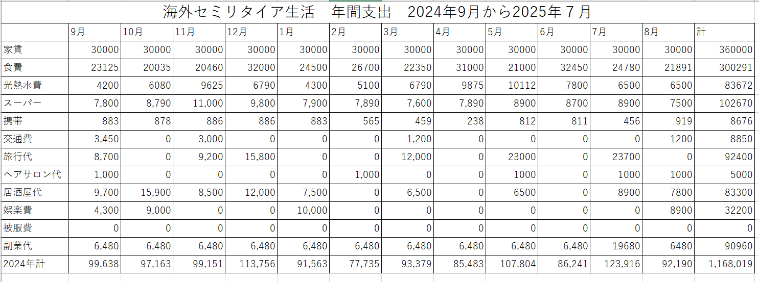 参考までに海外セミリタイア生活の直近1年間の生活費を載せます。もし良かったらご覧ください。