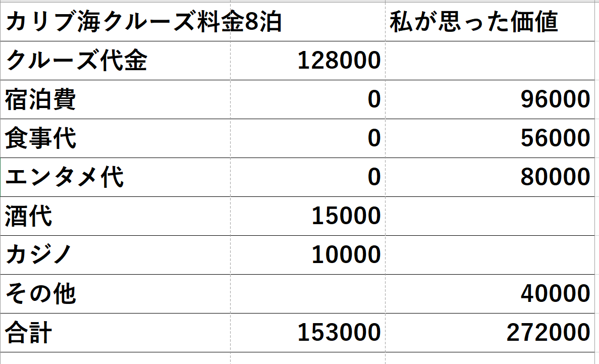 クルーズ旅行の経験、宿泊、食事代、エンタメ代など総合すると30万程度の価値があると私は思いました。